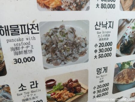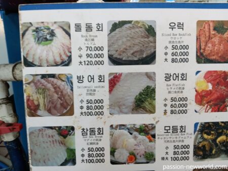こちらのお店は石鯛刺身の中が9万ウォン(約9000円)、クロソイ(ウロッ)、ヒラメ(クァンオ)が同じく6万ウォン(約6000円)。ひところの2倍はする。