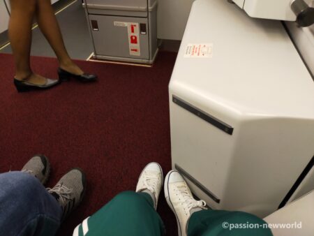 実際に指定された席はシートが並ぶ狭苦しいエリアではなく、前方に広々としたスペースがあるので脚を伸ばせる。ただ、CAからは同様の要請を再度、英語で説明された。