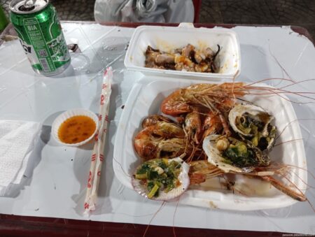 どこの屋台でも魚介類を数種類セットにした30万ドン(約1800円)コースを提供している。こちらはエビとホタテなど。