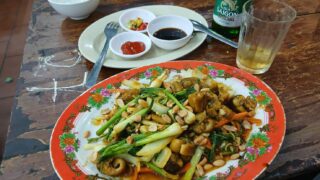 店によってラインナップは異なる。どれにしようか迷っていると店の女性スタッフが「サービスしますよ」とうれしい一声。タコの足を少し大きめのものに入れ替えてくれた。さらに「青菜(モーニンググローリー)の炒めも付けます。値段は同じ30万ドンでどうですか?」と追加サービスの申し出。それはとてもお得と思い注文することに決めた。こちらの席に案内され別途、缶ビールを注文。3万ドン(約180円)。