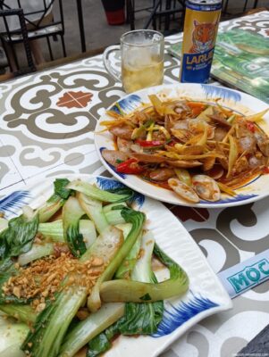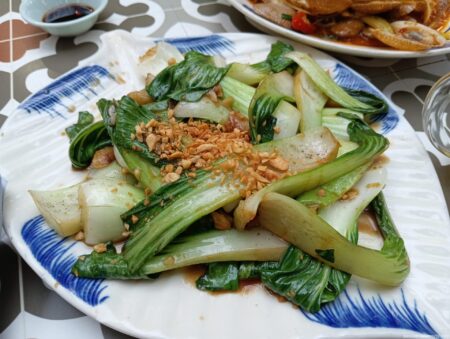 こちらは日本でいう青梗菜(チンゲンサイ)かな。大粒のニンニクが10個くらい入っていて上にピーナツの砕いたものが振りかけてある。香ばしさが倍増だ。
