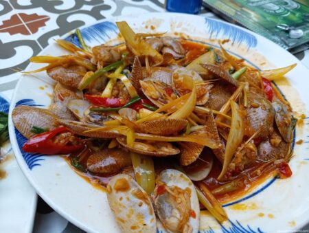 注文したのは二枚貝の香草野菜とシトロネラ炒め。「シトロネラ」とは聞きなれないが、柑橘系に似た優しく爽やかな香りが特徴的なイネ科のハーブで、レモングラスの近縁種。形状や歯ごたえがよく似ているもののシトロネラの方がやや大きい。