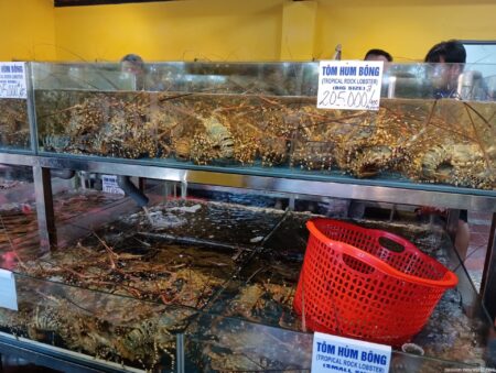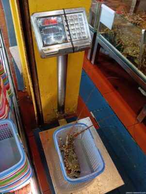 100グラムで20万5000ドン。日本円だとざっくり1200円。男性スタッフに中型のロブスターを測ってもらったところ、約800グラム。つまり1匹注文すると、9600円だ。