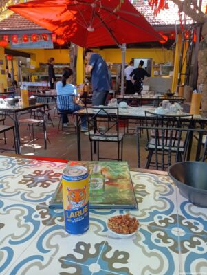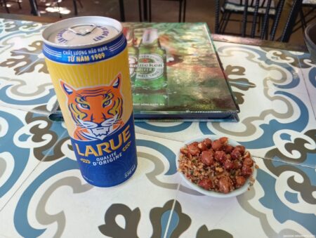 席に戻りまずはビールを注文。LARUE1万6000ドン(約100円)。ピーナッツはサービス。