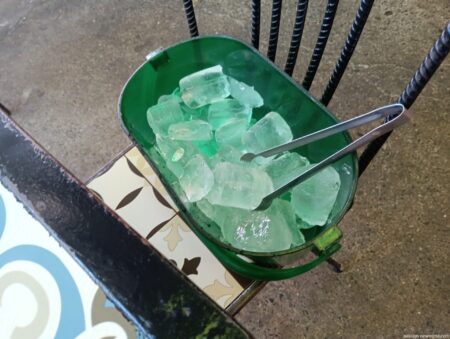 ビールに氷を入れて飲むスタイル。もちろん氷は無料。円筒形で中心に穴があいている。飲料がすぐに冷えるようにする工夫だ。