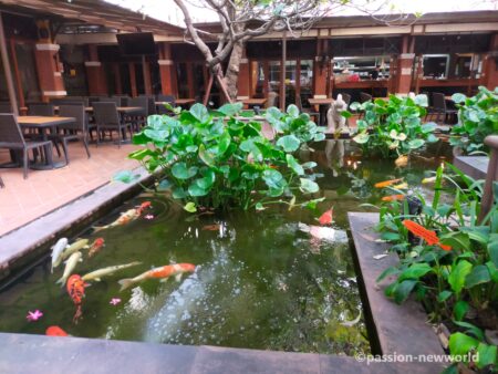 鯉が泳ぐ池の周りにはテーブルと椅子が用意されており、こちらで休憩するとどこか高級リゾート地に滞在している気分になってくる。
