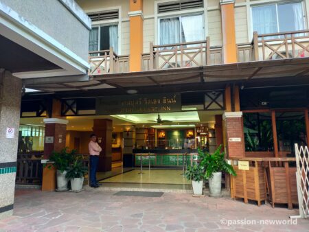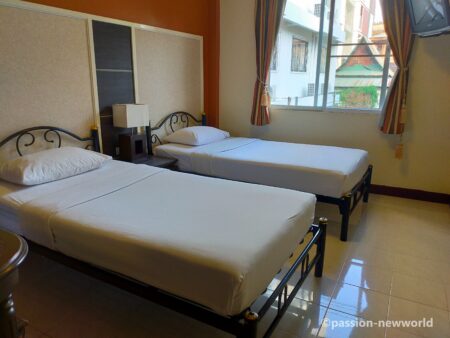シングルを予約したのだが、受付の女性は「ツインの部屋をご提供します」と望外のオファーが。シングルのほぼ倍の値段がする部屋へのチェンジはうれしい限り。広さは 20 m²平米、シングルベッド2台の広い部屋となった。デポジットは500バーツ。チェックアウトは正午。眺望抜群とは言えないが、光が差し込むので及第。