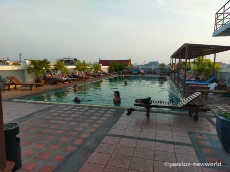 プールは別棟。近くのワットチャナソンクラームの黄金の屋根が見渡せる。