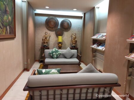 リセプションの近くの小スペースも美しく装飾され、まるで高級ホテルの佇まいだ。