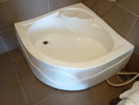 不思議だったのは奥の“バスタブ”。目の錯覚で全身がお湯につかれるように見えるかもしれないが、実際はかなり小さくお湯をためたり浸かったりはできない。このエリア内で洗髪、ボディ洗いなどをすべて済ませなさい、ということらしい。そうすれば周囲が水浸しになることはない。