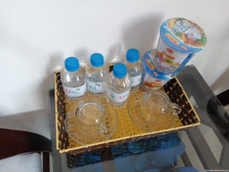 ミネラルウォーターは小さめボトル計4本でこれは無料。カップ麺は有料だ。