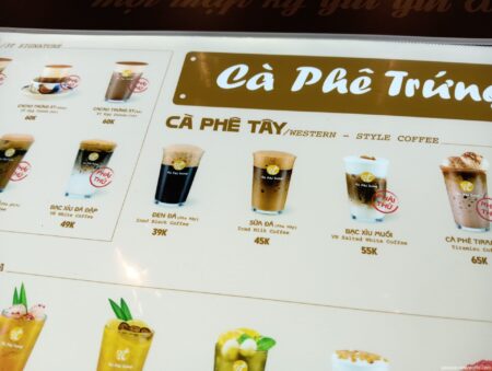 オーダーはこちらから。ハノイの名物であるエッグコーヒーが有名。 卵とコンデンスミルクをホイップしたカスタードクリームを、コーヒーの上にのせている。 ベトナム語はCà phê trứng(カフェ・チュン)だ。