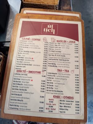 メニューはこちら。コーヒーは2万5000ドン(約150円)からとかなりリーズナブル。