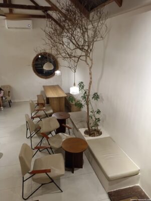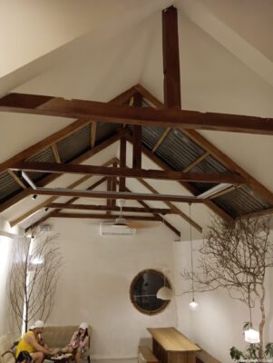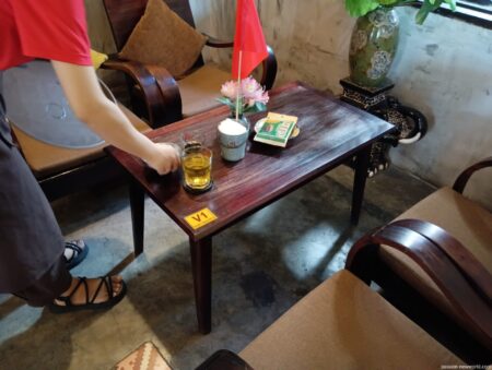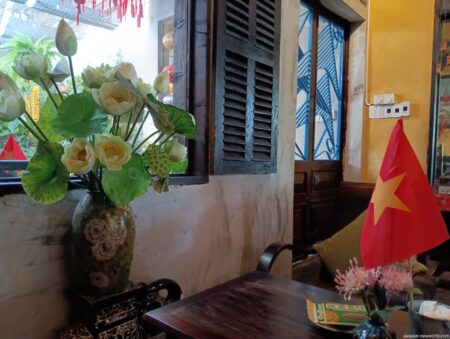 外観も内装も古都・ホイアンのようで素敵。 木造の調度品に癒され、風と日差しが入ってきて心地よい空間だ。 おススメのココナッツのドリンクは65kと少し割高だが、店の雰囲気の良さもあり満足。