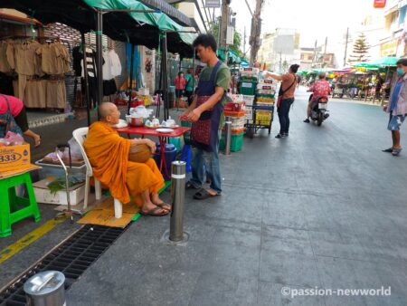 歩を進めると托鉢中のお坊さんが商店主と談笑。見ているだけで心が和む。