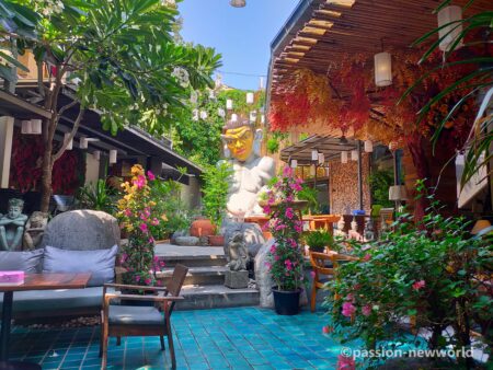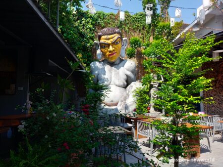 ぶらぶら継続中。ふと左手を見て仰天。巨大顔面像がこちらを睨んでいる。若い女性店員さんに聞くと「ブッダ」との答え。斬新過ぎるインテリアだ。夜は欧米人で賑わっていた。