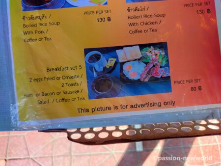 試しに左側の店をのぞくとモーニング80バーツ(320円)。隣の半額。