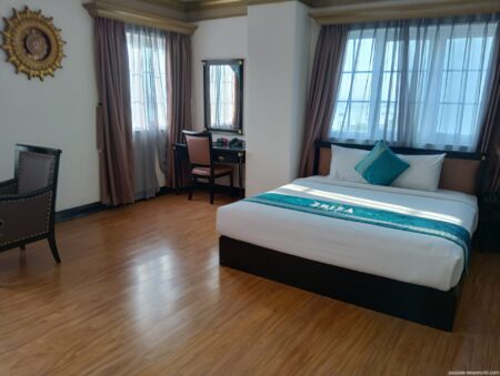 agodaで予約したら朝食付きで3800円ほど。部屋もきれいで窓からの景色もよいのだが、中心地から距離があること、そしてホテル前の通りの交通量が多く騒音が少し気になる。