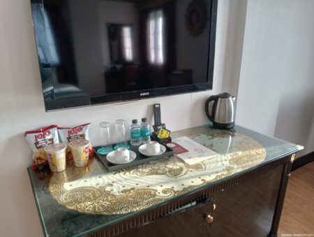SONYの液晶テレビ。電気ケトルと無料のミネラルウォーター2本、コーヒー、紅茶。カップ麺とお菓子は有料なので手を付けないことにする。