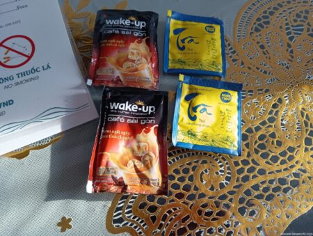 インスタントコーヒーの「wake-up」。コーヒー、クリーム、砂糖がワンパックの中に入っている。かなり甘い。