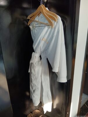クローゼットに入浴後に着られるガウン。パジャマ類は持ってきていないのでこれは非常に助かる。
