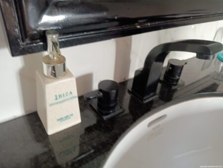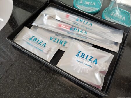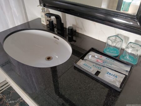 さて、水回り。清掃が行き届いていてピカピカだ。歯ブラシ、シャワーキャップ、櫛、綿棒。蛇口の左側には手洗い用の液体せっけん。