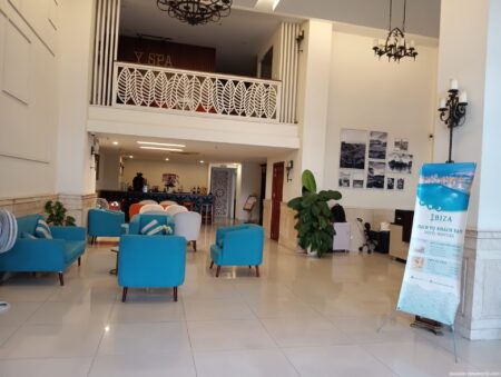 フロント前のスペースにはソファとテーブル。チェックアウトを終えた客、これからチェックインする客が大勢座っていた。かなりの人気ホテルのようだ。