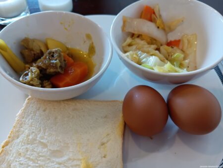 3巡目はトーストとゆで卵、野菜炒めにフルーツ類。ヨーグルトもいただいた。
