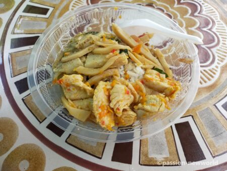 テイクアウトしてホテルの中庭で食べてみる。はやり、筍と鶏肉を別々に盛り付けていて、しかもごはんがふやけていない。カレーの水分は下にたまっていて、上部の筍や鶏肉と混ぜ合わせて食べられるようになっていた。これは旨い。タイの人々の知恵と工夫がこもった一品だった。