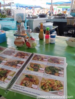 メニューを見て注文したのは野菜とチキンの炒め物ご飯。50バーツ、約220円だ。