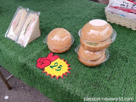 チキンのハンバーガーは25バーツ(約100円)だ。赤い指のVサインがかわいい。