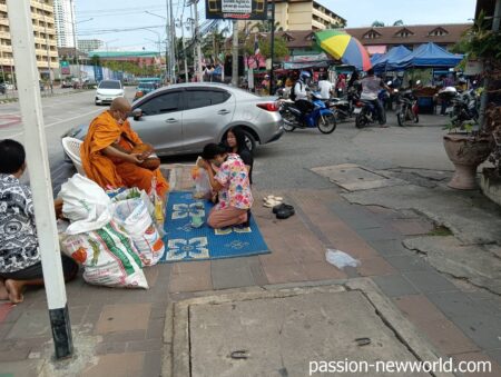 ふと見るとお坊さんのタンブンが。タンブンとは托鉢(たくはつ)のお坊さんにご飯や料理などを喜捨して徳を積むこと。善行が自分の来世に返ってくることを祈って行う。観察していると、お坊さんの右横にデカい袋が。集まる量がハンパないようだ。