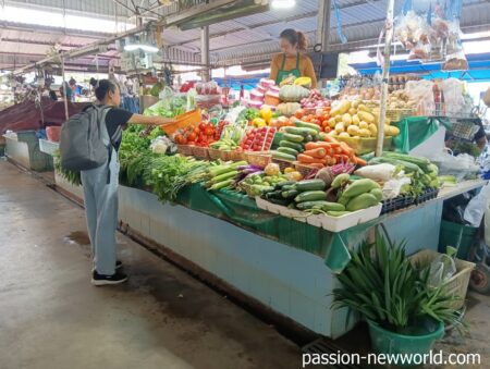 さて、市場内の店舗を回ってみる。屋内では野菜や果物を販売中。