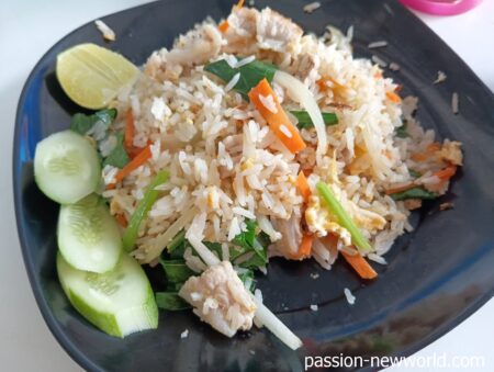 このパラパラ感がたまらない。豚肉にニンジン、オニオン、子ネギ、ハーブが入り、ライムをしぼって味を調える。たまらなく旨い! タイを訪れて以来、約30年。思い出せば、タイのあちこちを歩いたが、どこに行ってもこのカオパをひたすら食べていた気がする。それほどの好物なのである。当時は20バーツほどだったか。