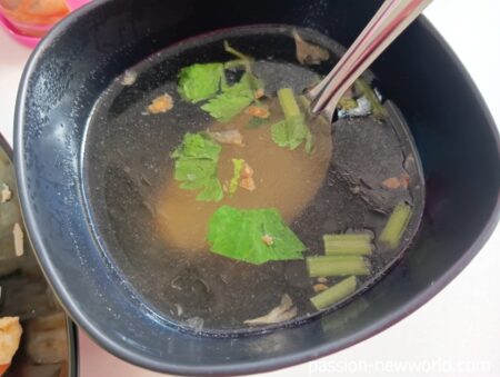 パクチーを散らしたスープはチキンベースにナンプラー、焦がしたニンニクの皮で味付け。こちらも旨すぎる!