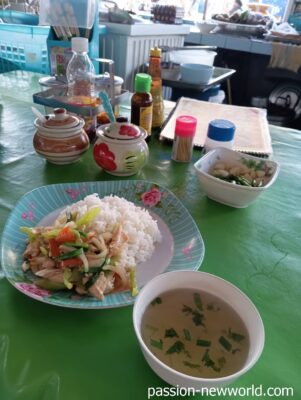 チキン、バジル、オニオン、トマトなどをナンプラーとニンニク風味で炒めたタイ料理。これは朝からご飯がすすむ。ネギをちらしたスープがまた旨い。
