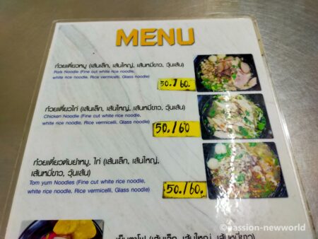 地元の人が大勢訪れる人気店。店内には欧米からの旅行客もたくさんおり、うまそうに麺をすすっている。メニューを見て「チキンヌードル」を注文。普通サイズで50バーツ(200円)。価格が黄色い紙に書かれているが、元は普通40バーツ、大盛り50バーツ。原材料費などの高騰で10バーツの値上げを余儀なくされたようだ。