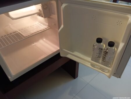 冷蔵庫にはミネラルウォーター2本。ただ、冷蔵庫自体が小さい。