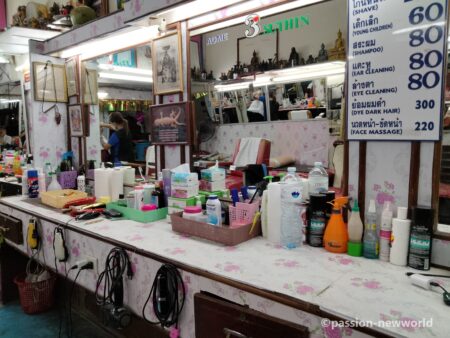 100バーツという格安料金のためかレトロ感漂う店内にはエアコンはない模様。このため少々暑いが、我慢できないほど暑くもない。他店は120バーツ、150バーツという価格設定が多いようで、これらの床屋さんはエアコン、WiFi完備である。今回の格安理髪店は飛び込みに近い形だったが、お得感があって大満足だった。