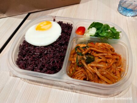 リーズナブルなお弁当を探していたところ、黒い米を使ったお弁当を発見。これってタイの黒米なのか? 深紫色の細長い米粒という形状から判断するに、これはタイの国立大学が開発した「ライスベリー」らしい。 抗酸化作用をもつポリフェノールや食物繊維が含まれており亜鉛、鉄、ビタミンB1、ビタミンE、葉酸、オメガ3など体に良い栄養素が多いという特徴がある。ライスの上には目玉焼きがちょこんとのっていてカラフルだ。
