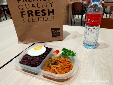 フードコートのテーブルに持って行って味見。ライスの味自体にクセはない。玄米なので歯ごたえがある。おかずは筍(たけのこ)と豚肉の炒めもの。ミニトマトとレタスなど生野菜も入っている。これで65バーツ(260円)は安い。フードコートでは麺類でも100バーツ(400円)以上はする。節約という点でお弁当に目を付けたわけだが、偶然にも「ライスベリー」を初体験できてラッキーだった。「DELI BAR」でお弁当を見かけたら、白米ではなく黒っぽい深紫色の「ライスベリー」に注目だ。