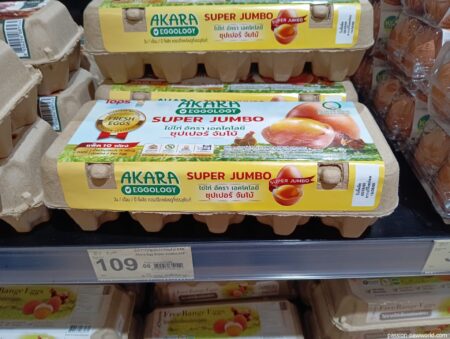 超大玉になると10個入りケースが109バーツ(480円)になるからかなり高い。といっても特売49バーツの卵もそれなりの大きさだった。日本のスーパーではSサイズ10個入りパックが230円ほどの値段なので、物によりタイの方が若干安いが、食堂のカオマンガイや麺類が1品50バーツほどであることを考慮すると、タイの鶏卵は感覚的に高い気がする。