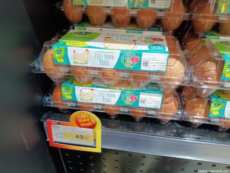 「FIRST BORN EGGS」という名がついており、特売で10個入り49バーツ。約220円(1バーツ、4.4円で計算、以下同)だ。