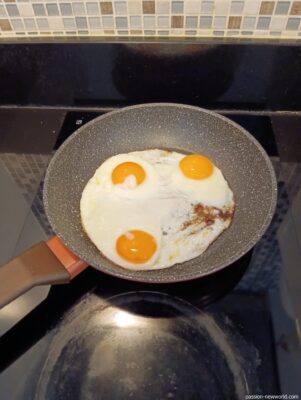 宿泊したコンドミニアムのキッチンを使って目玉焼きを作ってみた。やはり朝は目玉焼きがないと始まらないw