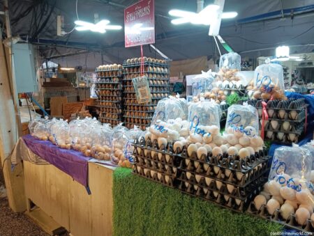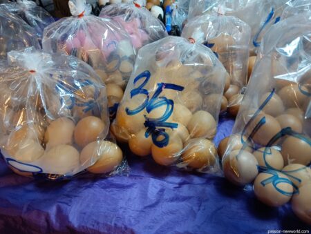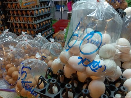 白い鶏卵は60バーツ(265円)。卵1個のサイズが大きくなるほど値段が高くなるのは当然ながら、意外にも市場で販売している卵は予想よりも安くはなく、日本のスーパーとほぼ変わらない価格帯だった。