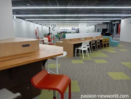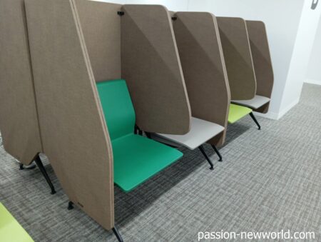 広めのスペースに風変りな椅子が並んでいて面白い。隣を気にせず座れる敷居がある。