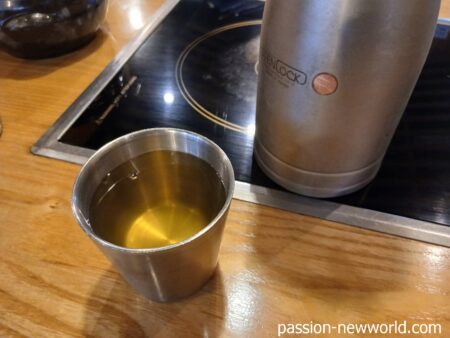 かなりのボリュームで1万2000ウォン(約1300円)はお得だ。午前11時半ごろに入店。客はまだまばらだ。最初に出された水…と思いきや、スンニュン(ご飯のおこげ湯)だ。こくがあってうまい。香ばしさが食欲をそそる。