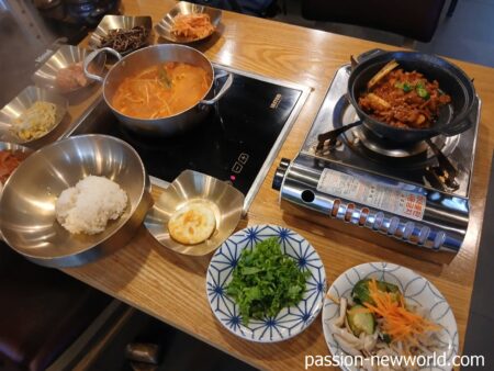 さて、メニューを見て注文。意中の「特選ランチ」はよく見ると、「2人分以上から」と但し書きがある。この日の私はひとり。スタッフに尋ねると「1人分からでも大丈夫ですよ」とうれしい返事が。そこで、特選ランチの「キムチチゲコース」を注文した。すると出てくる出てくる大量のおかず類。豆腐キムチ、もやしのナムル、白菜キムチ、ぜんまい、大根キムチ。そしてメインのキムチチゲ、炒めた肉。