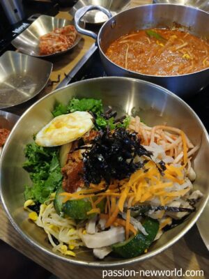 大きなお椀に白いご飯。ここに野菜類とテーブルにある海苔とごま油、コチュジャンを入れてひたすらかき混ぜる。そう、野菜や肉類の配分を調整して自分だけのビビンバを作るのだ。
