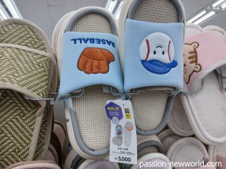 こちらのスリッパは左右ふぞろいのデザイン。ボールとグラブで1セットとは微笑ましい。お値段は5000ウォン(約500円)とやや高め。